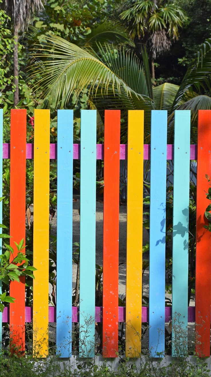 The simple design of the fence makes the colors the main attraction. You can see how each slat has small specks, giving a casual, handmade feel. It’s like a splash of fun in the middle of a green paradise.