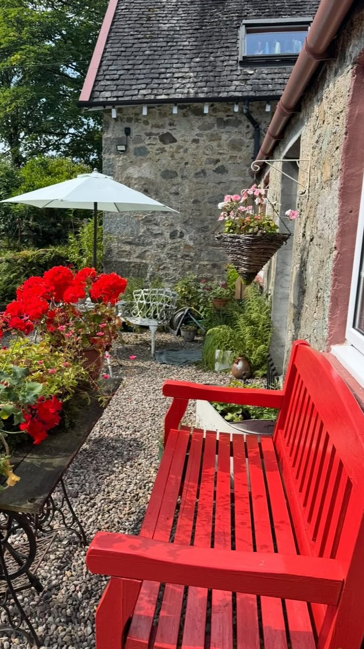 A bright red bench stands out against the earthy tones of the stone wall, inviting you to take a seat. It’s nestled in a small garden area, surrounded by vibrant red flowers that add a pop of color. The bench backs against a cottage-like building, giving the whole scene a rustic charm.