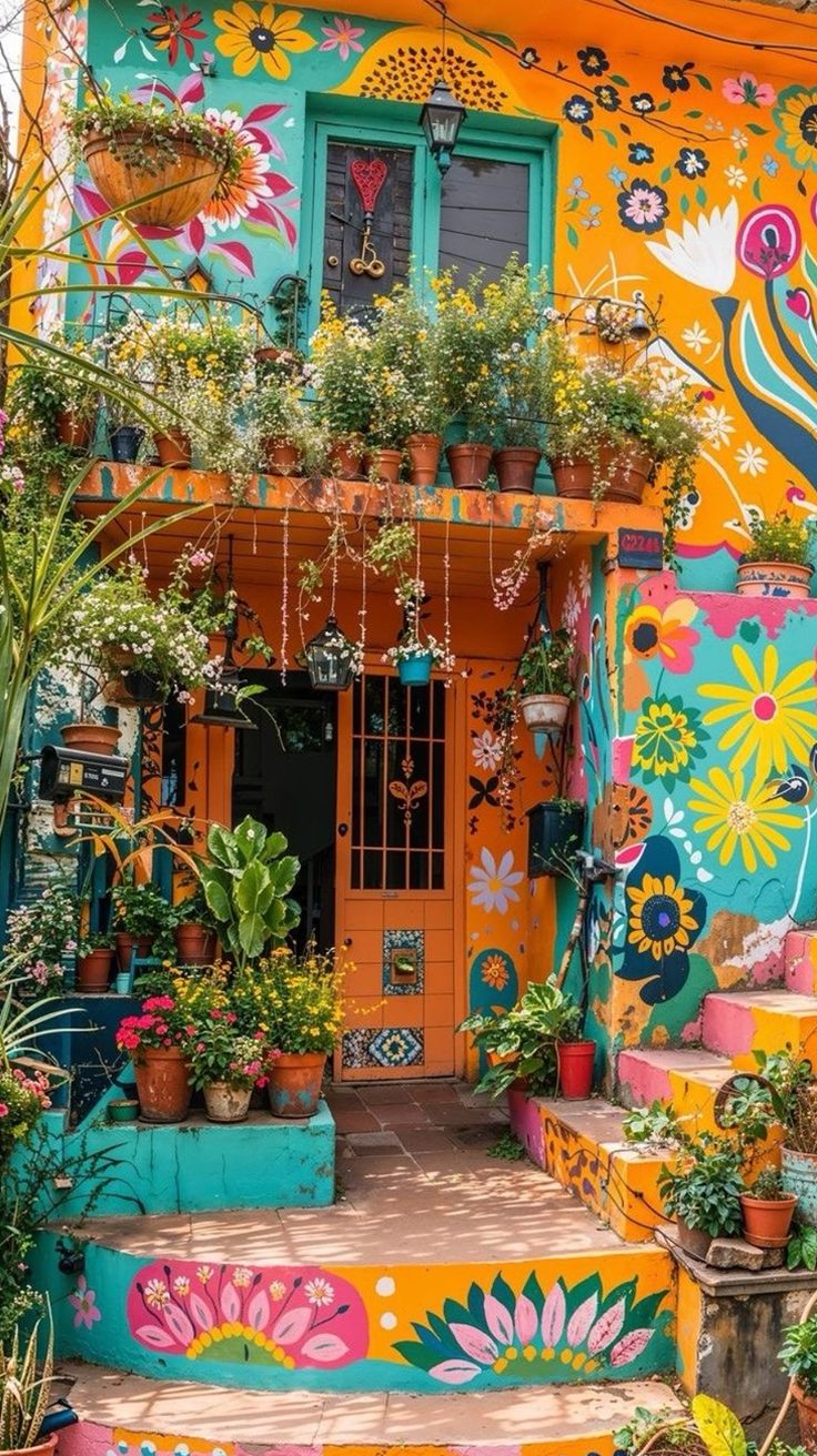Potted plants line the steps and balcony, adding real greenery to the painted florals. Each step is decorated with unique patterns, drawing your eye upward toward the door. The combination of real and painted flowers makes it feel like a living artwork.