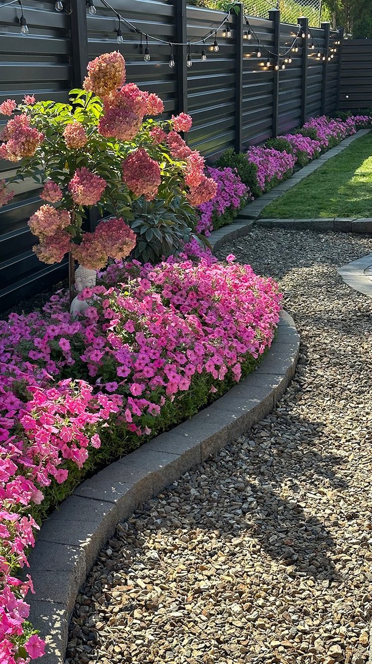 Vivid pink flowers line the edge of a neatly paved garden path, creating a striking contrast against the dark gravel. These bright blooms lead the eye towards an elegant black fence adorned with a string of warm, glowing lights. It feels both lively and serene, an inviting blend of color and light.