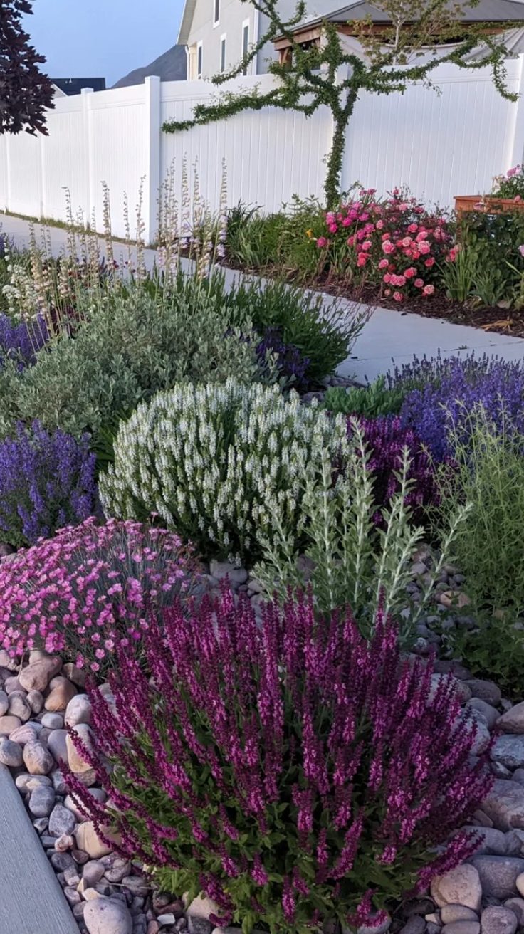 Bright magentas and purples grab your attention immediately. These colorful flowers create a vibrant border alongside the pathway, standing out against the neutral stone bed below. It’s all framed by a crisp white fence, adding a clean contrast to the scene.