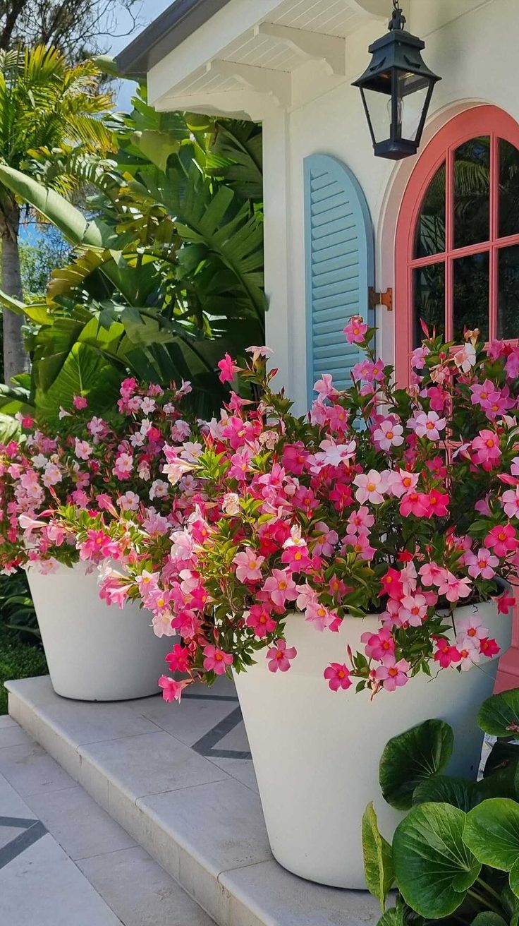 Bright pink flowers in large white pots line the steps, offering a warm welcome. The colors pop against the blue shutters and coral door frame. Each blossom seems perfectly arranged, creating a lively and inviting entrance.