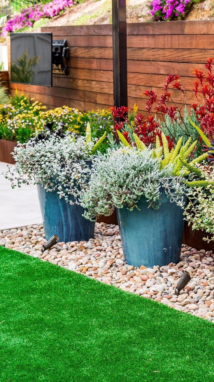 A wooden fence runs along the background, creating a cozy, enclosed feeling. The fence is lined with more pops of color from the flowers, adding depth and variety. Smooth pebbles cover the ground around the pots, providing a clean and organized look that’s easy on the eyes.