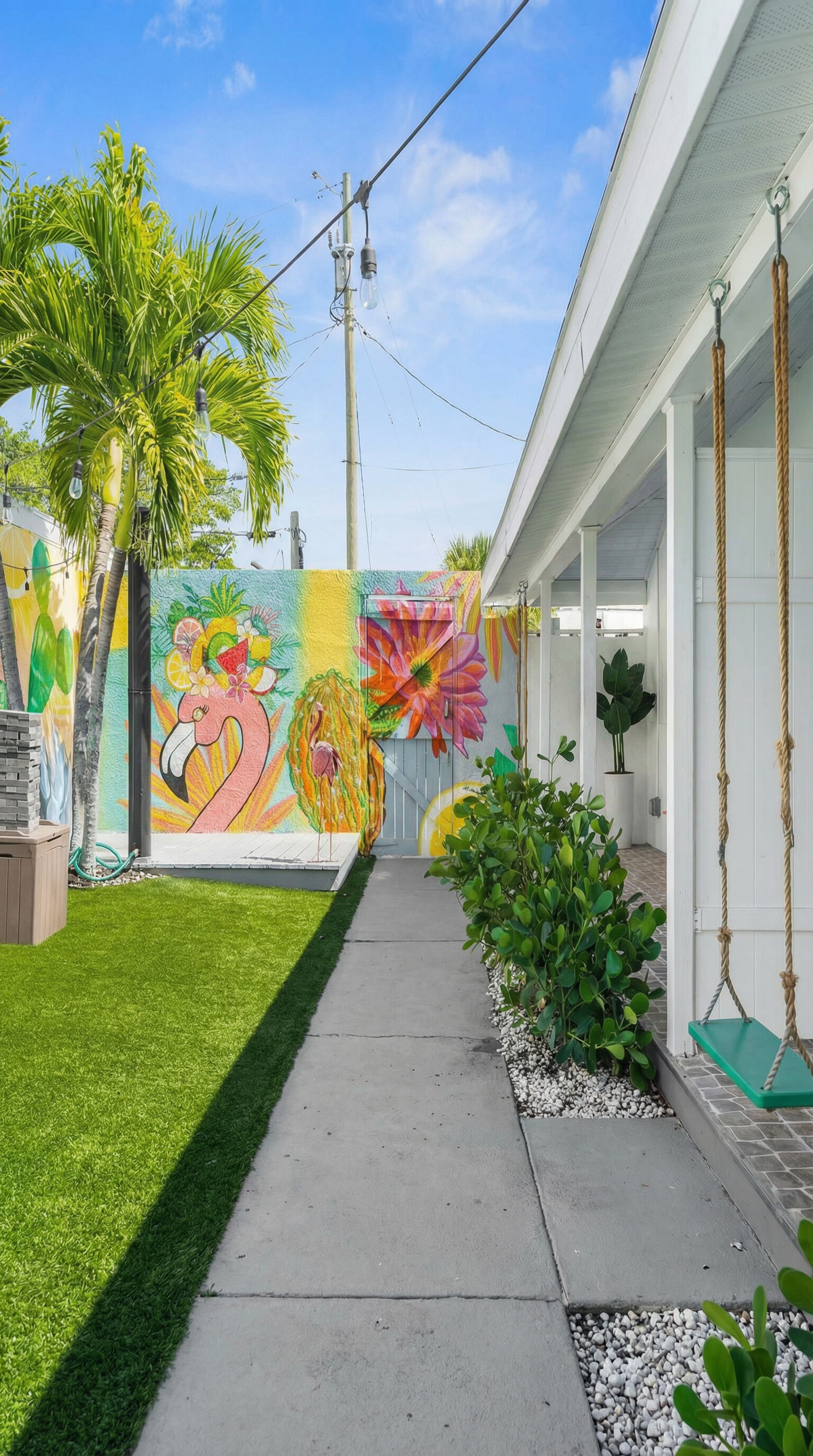 To the left, lush green grass contrasts with a tidy concrete path leading to the mural. On the right, a simple white building porch hosts two swings hanging by thick ropes, hinting at relaxation and fun. Simple greenery lines the path, their leaves providing a touch of freshness.