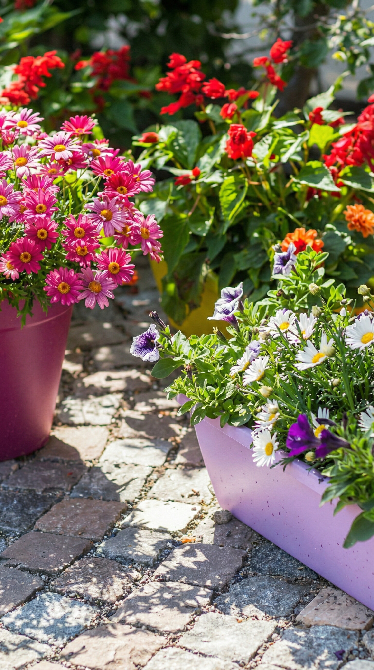 Bright pink and purple flowers are popping in cheerful planters. Their vibrant hues stand out against the textured stone walkway. Sunlight highlights the vivid reds and oranges in the background, adding depth to the scene.