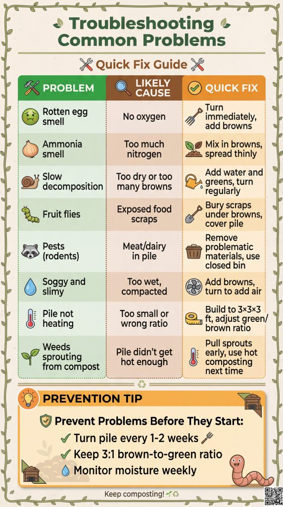 | 🌡️ Pile not heating | Too small or wrong ratio | Build to 3×3×3 ft, adjust green/brown ratio |
