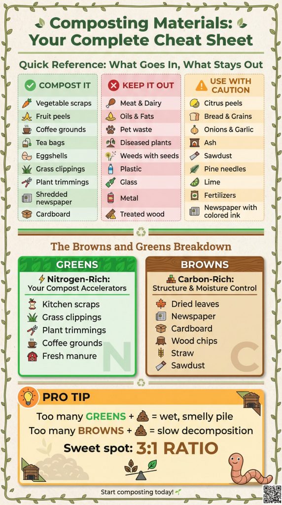 - Browns (Carbon): Dry leaves, straw, newspaper, cardboard