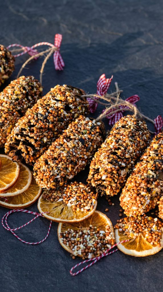 If you’re making these as garden decorations as well as functional feeders, tie a small ribbon bow over the knot at the top. Traditional red gingham or natural jute both look attractive against winter greenery.