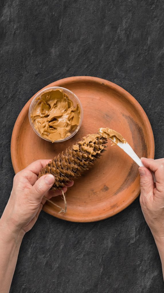 Working over a paper plate or tray, use your knife to spread a generous layer of peanut butter into all the crevices of the pine cone. Start at the base and work systematically towards the top, stopping just below where your string is attached.