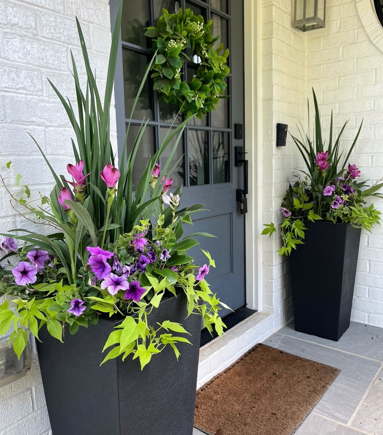 A pair of tall, black planters anchor each side of the front door. They’re filled with a lively mix of purple and pink flowers, coupled with leafy greens spilling over the edges. The arrangement adds a pop of color against the clean, white brick wall.