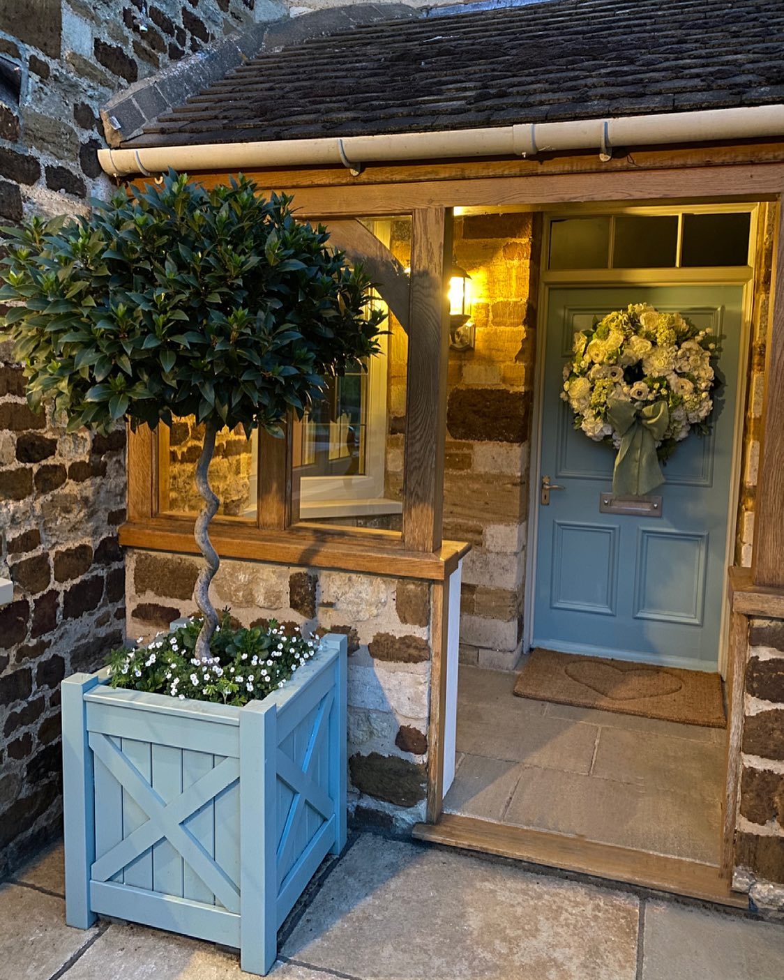 Nestled against a rustic stone wall, a wooden porch frame and roof create a cosy entrance. The front door, painted a matching soft blue, complements the planter perfectly. A lush wreath hangs on the door, exuding a sense of warmth and hospitality.