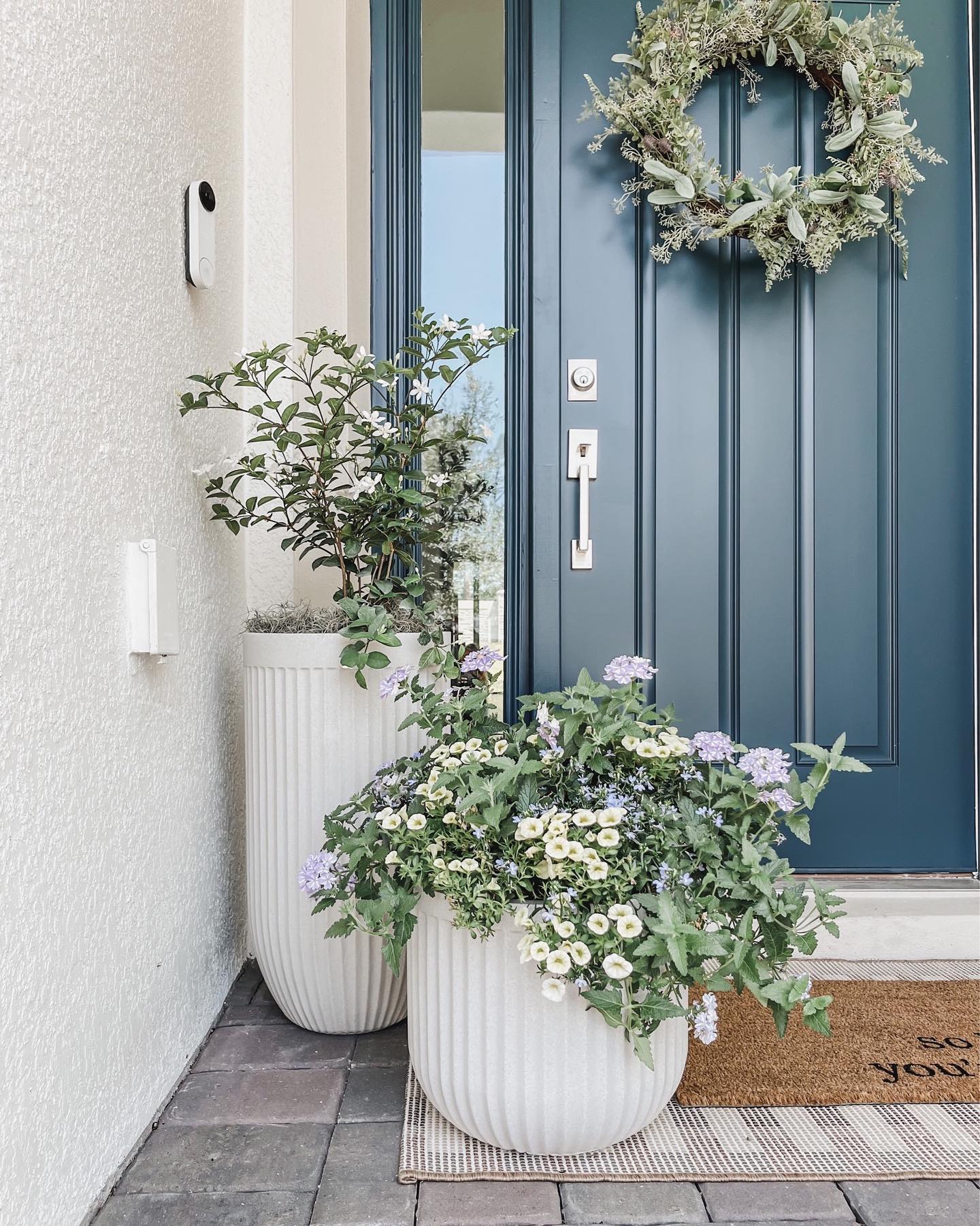 A deep blue door instantly catches the eye, framed by a simple yet elegant wreath of greenery. It gives off a welcoming, fresh feeling, perfect for inviting guests in. The choice of blue is bold against the light, textured walls, creating an inviting focal point.