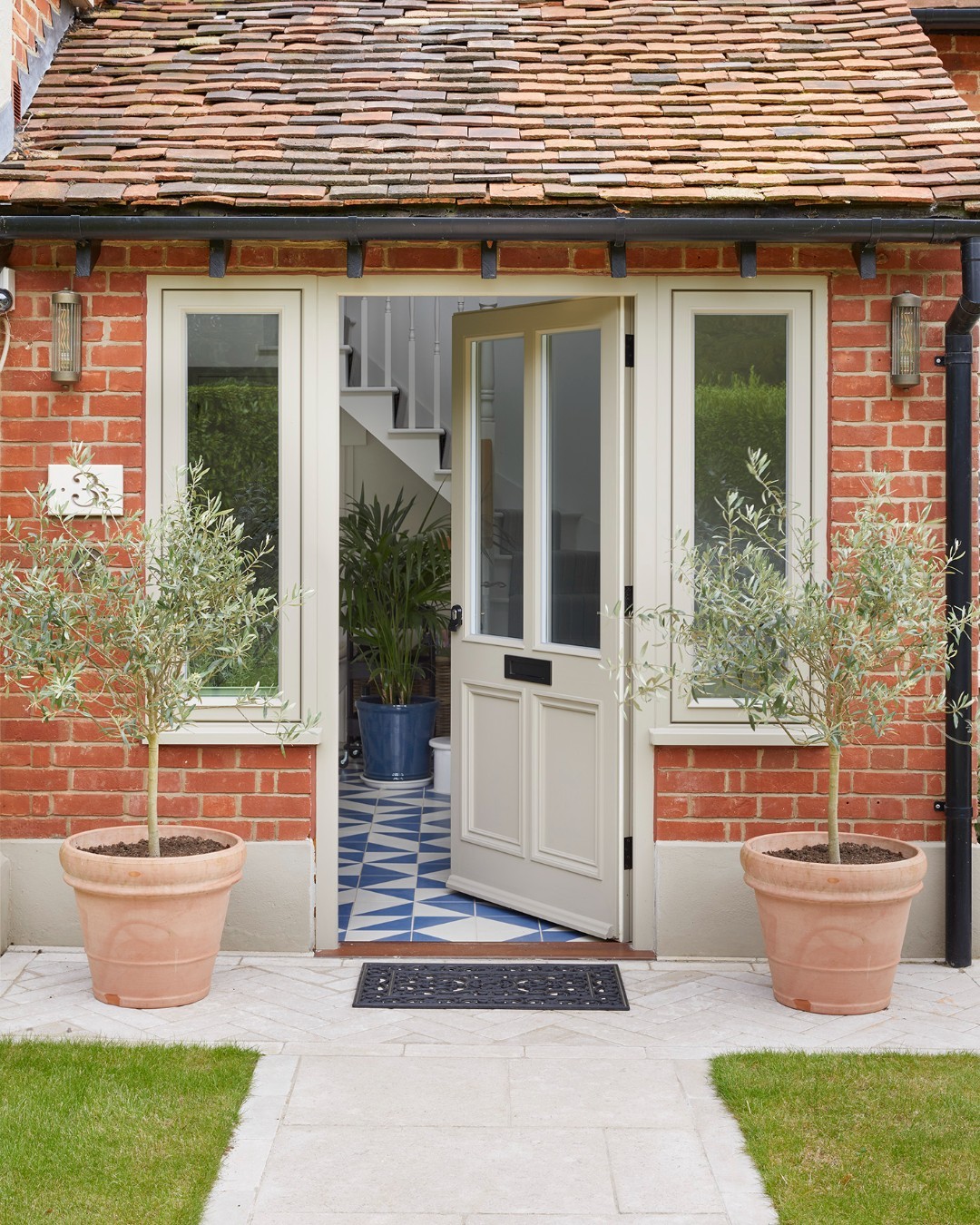 Two olive trees in large terracotta pots frame the entrance, adding a touch of greenery that feels both welcoming and stylish.