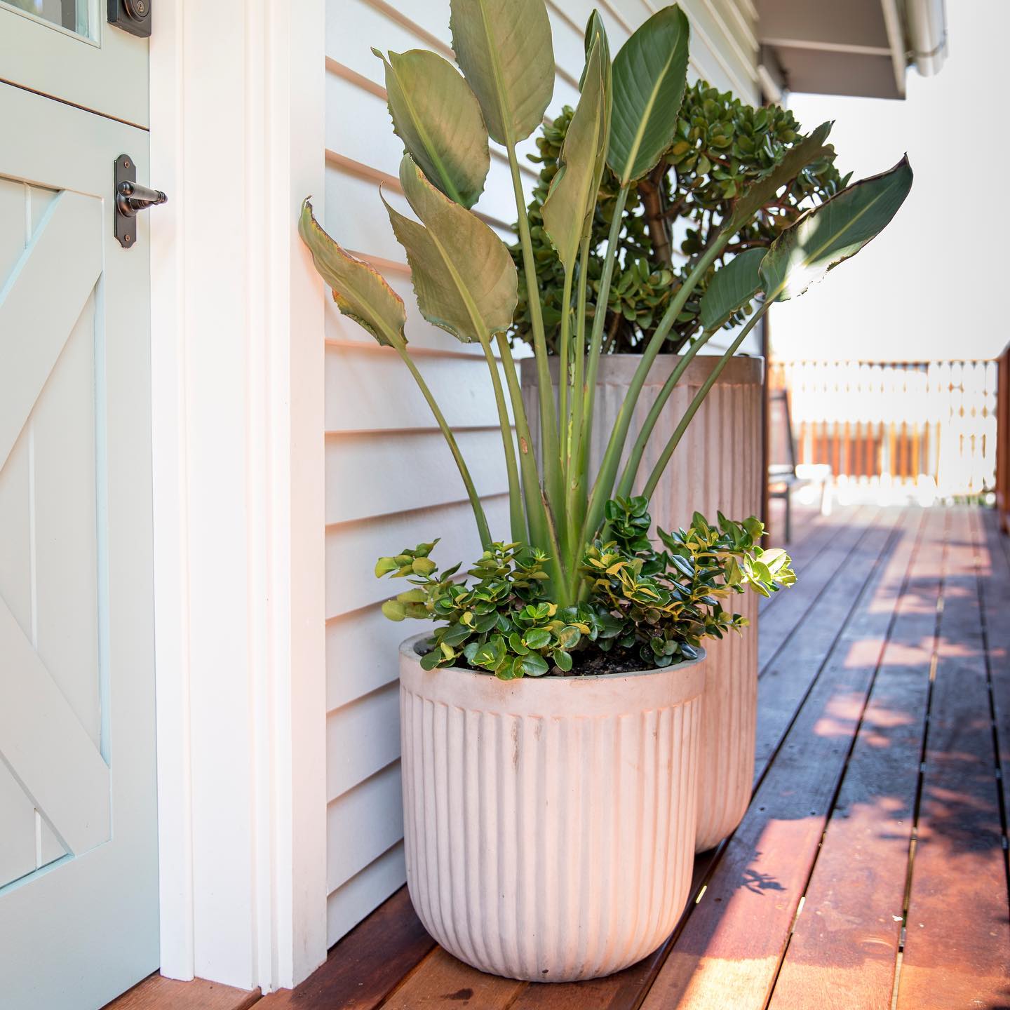 Two large, textured pots stand at the edge of the porch, bursting with lush green plants. The pots have a vertical ribbed pattern that adds a touch of elegance against the wooden deck. Their light color contrasts sharply with the rich greenery spilling over their rims.