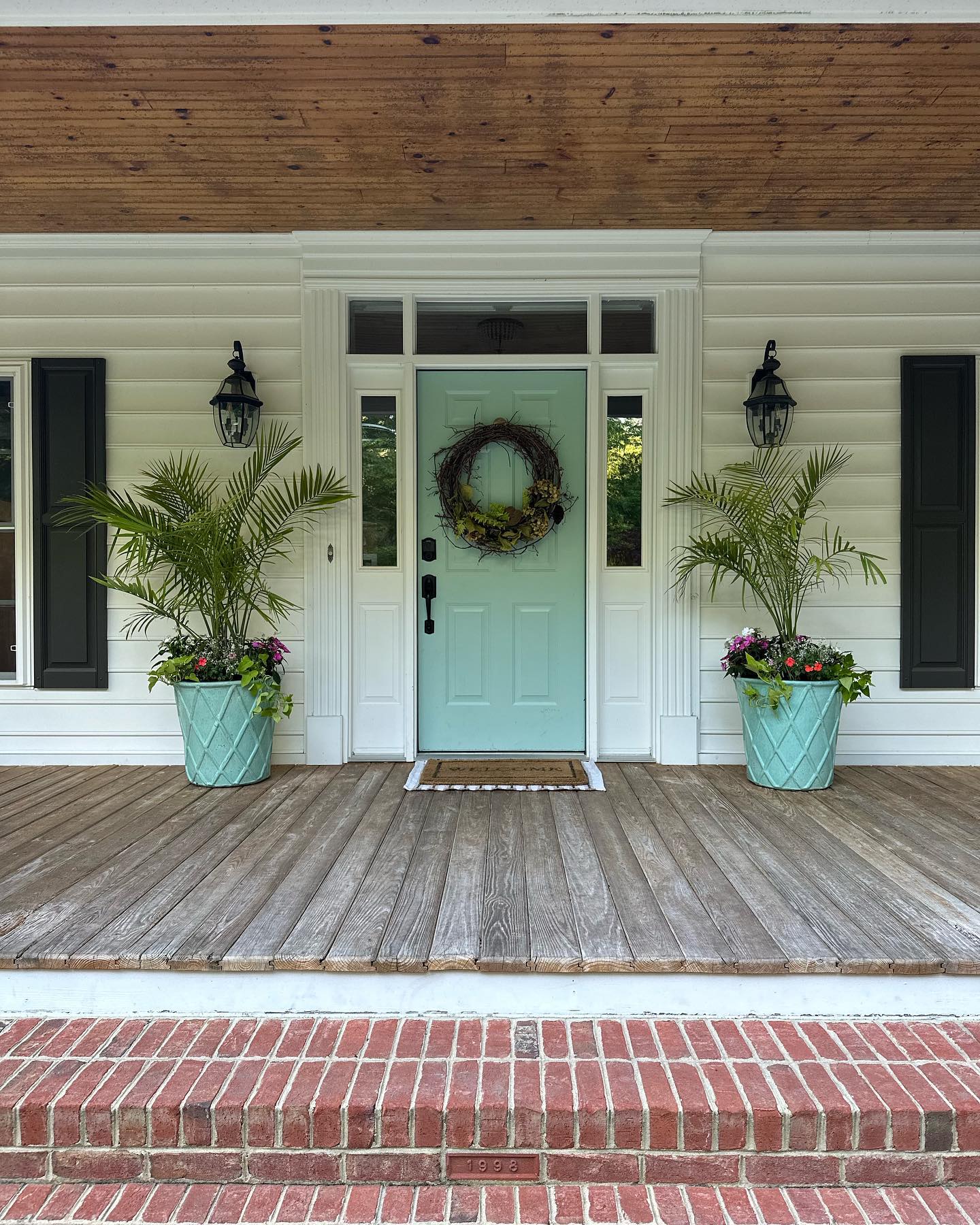 A mint green door steals the show against a backdrop of white siding. It’s flanked by two tall planters. Each planter is filled with a palm and colourful flowers, popping vividly against their turquoise bases.