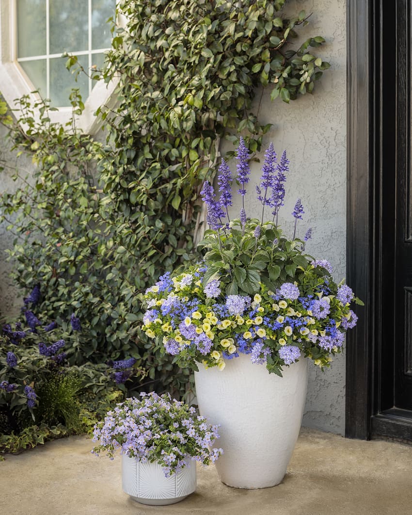 Bright purples and yellows catch the eye instantly, nestled in tall, white planters. The larger pot bursts with lavender spikes rising above a mix of smaller blossoms.