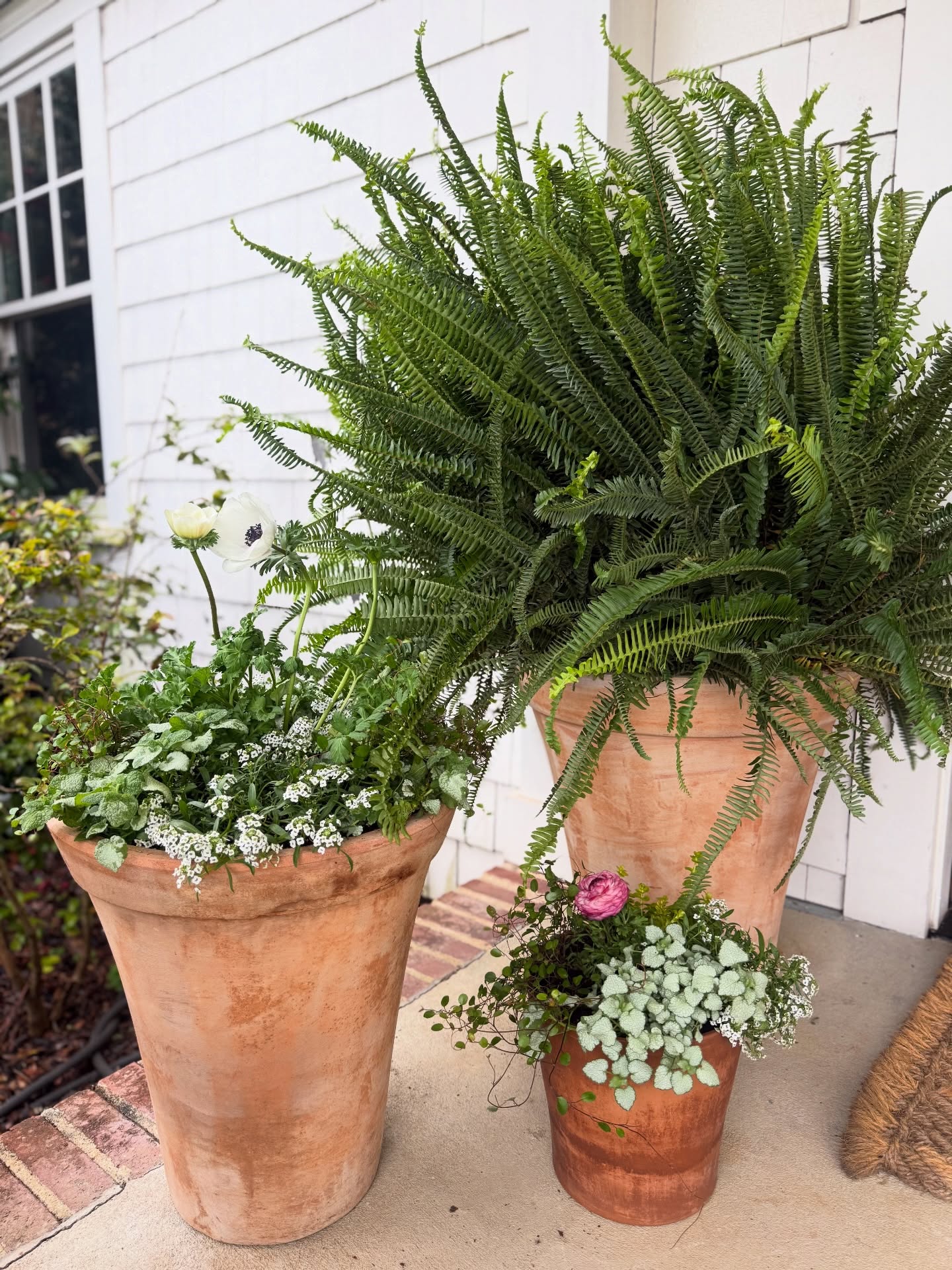 Bright green ferns spill over a large terracotta pot, drawing your eye immediately. The fern’s bold, arching fronds create a lively vibe against the clean white siding of the house. It’s paired with a second pot filled with delicate white blossoms peeking through lush greenery. Together, they frame the entrance with a simple, natural elegance.