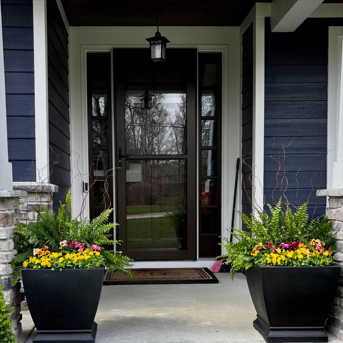 Flanking the entrance, two large black planters with vibrant flowers and lush ferns provide a burst of life. The mix of yellow and purple flowers pops against the greenery, giving the porch a fresh feel. It’s all about balance — nature meets contemporary design here.