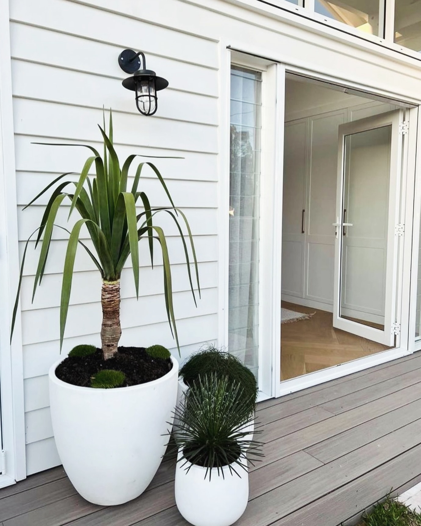 Above the plants, a simple black wall light offers a hint of industrial style. The sliding glass door, partially open, invites you into a clean, bright interior space. This setup offers a refreshing blend of greenery and minimalistic architecture, perfect for anyone who loves clean lines and a fresh outdoor feel.
