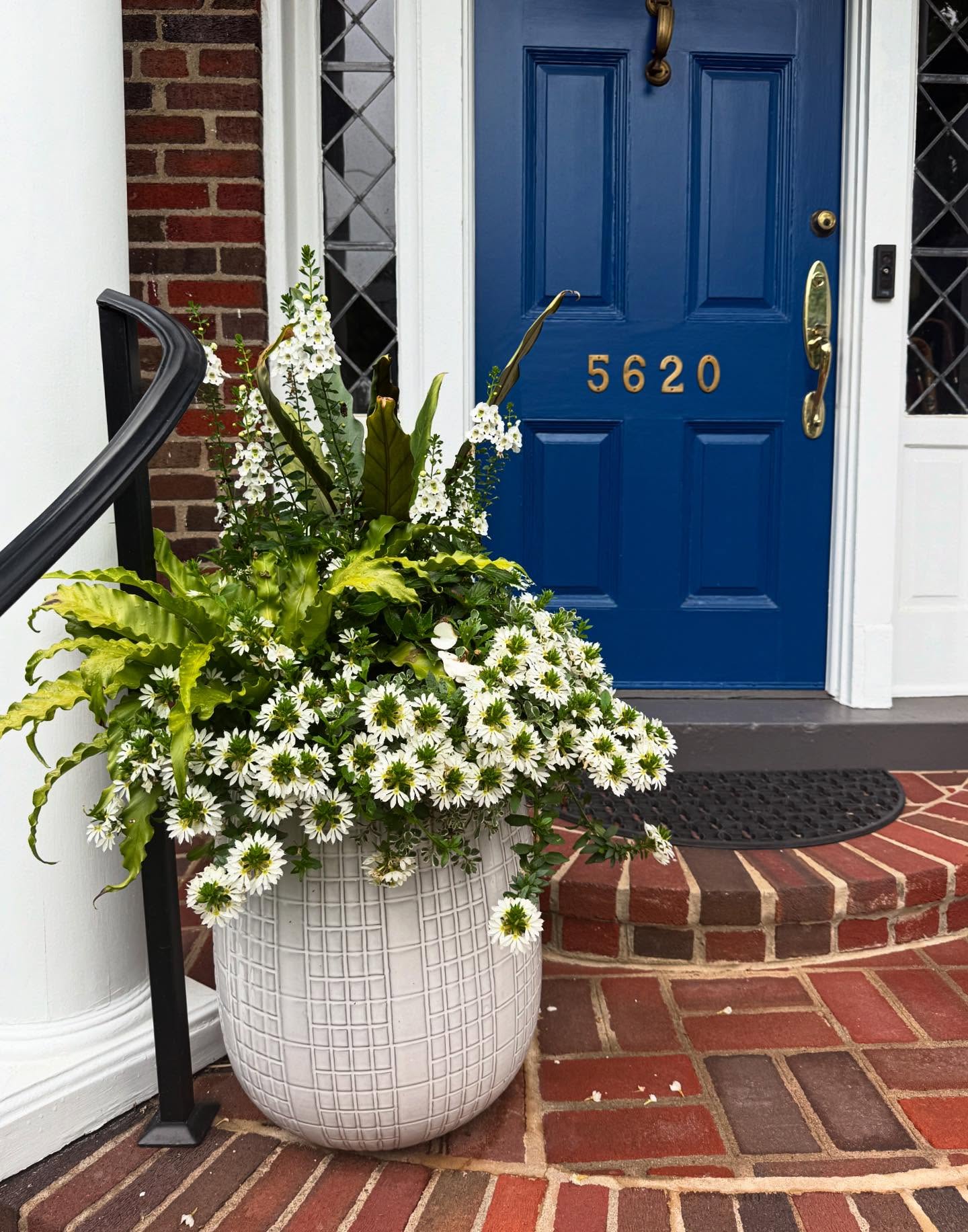 Right next to the door, there’s a big, white planter filled to the brim with lush greenery and bright white flowers. The flowers cascade over the edge, adding a fresh, lively contrast to the striking blue door. The sturdy black railing beside the planter adds a touch of elegance and subtly guides visitors up the brick steps.