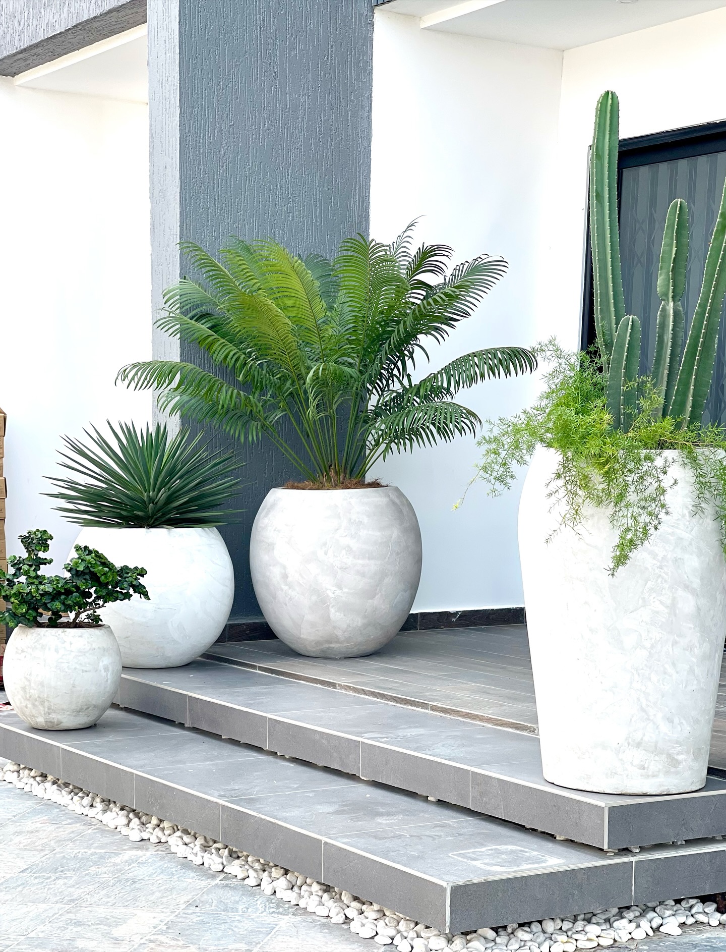 12. Cacti and Feathery Fronds in White Pots on Grey Steps