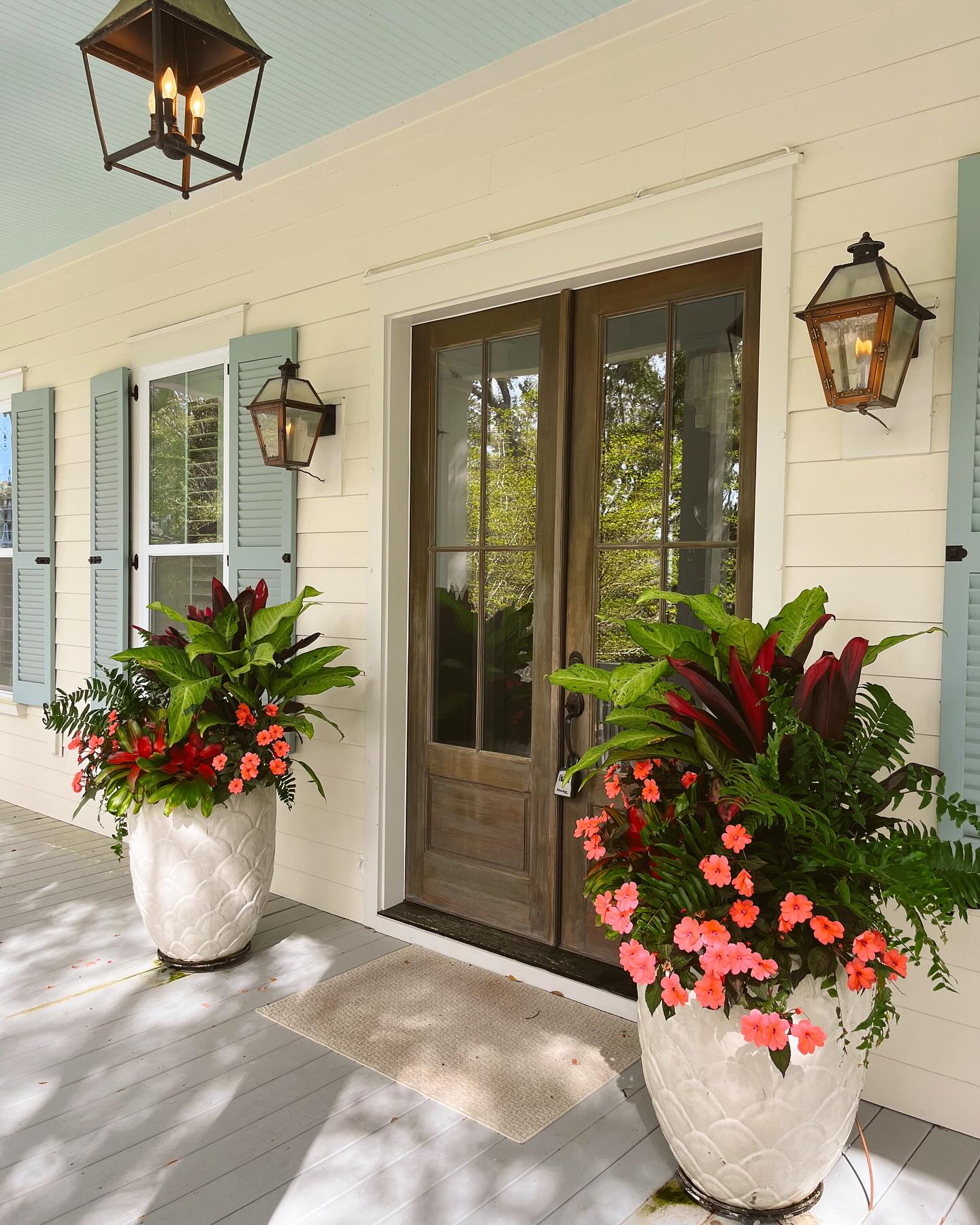 The wooden double doors have a rustic appeal, framed by traditional lantern-style sconces. These lights add a warm glow, making the entrance both welcoming and elegant. Crisp blue shutters flank the windows, adding a pop of color that feels fresh and coastal.