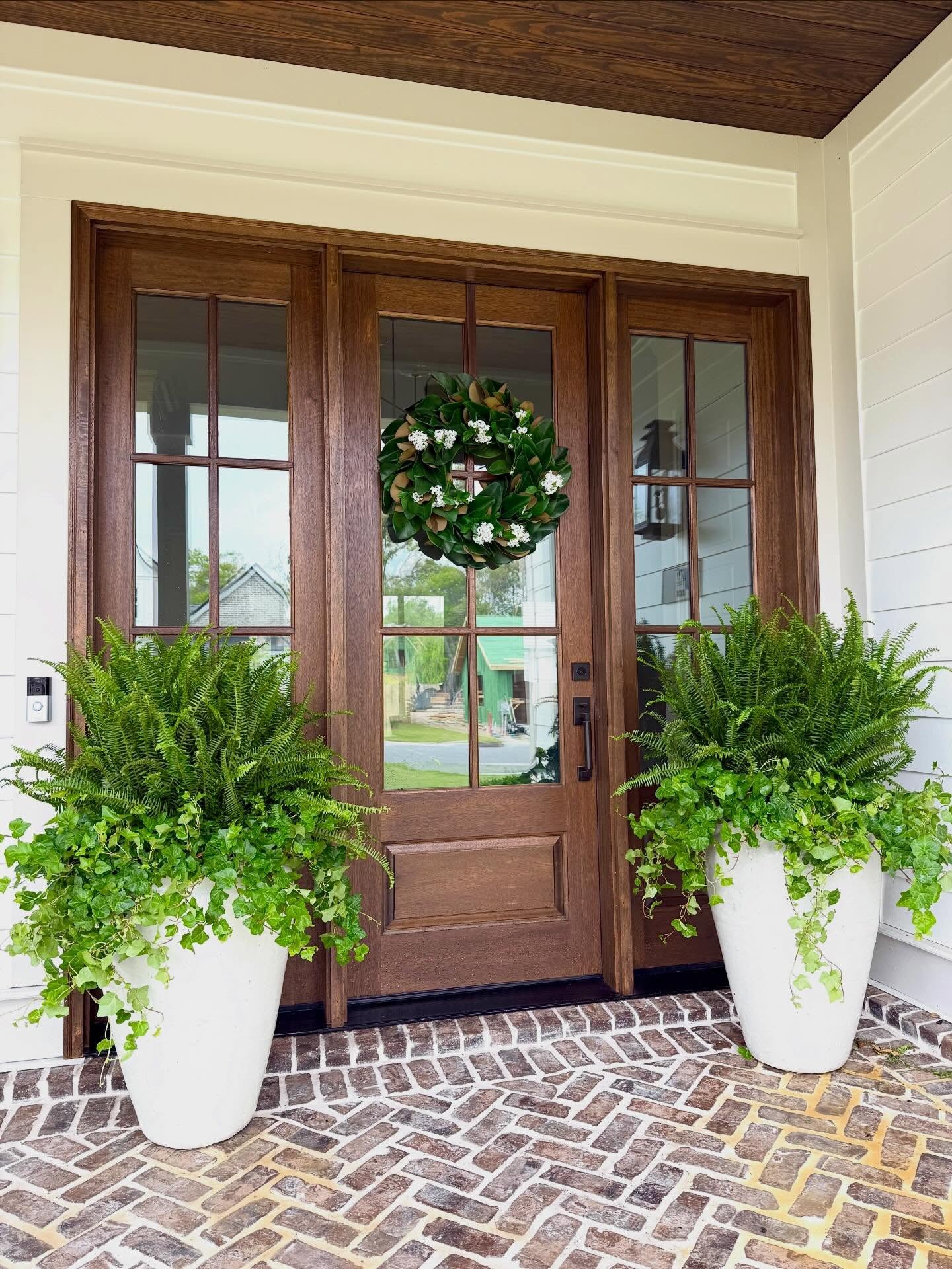 Two large white planters flank the entrance, brimming with ferns and trailing ivy. Their rich greenery contrasts with the clean lines of the planters. The herringbone brick pattern on the porch adds texture and an earthy touch.