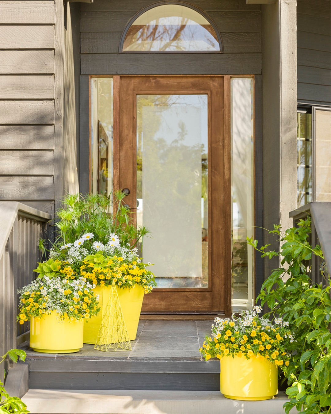 Vibrant yellow planters steal the show on this porch. The bright color pops against the calm gray siding, giving off a cheerful vibe. Packed with white and yellow flowers, they bring a lively contrast and charm to the doorstep.