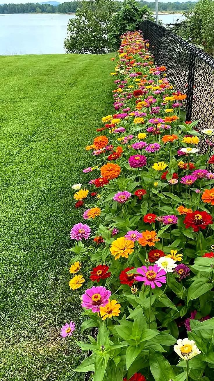 A joyful burst of colour runs the entire length of this fence line, turning a simple black chain-link boundary into a striking garden feature. Zinnias in vivid shades of magenta, orange, yellow, and red form a dense ribbon of blooms, their cheerful faces angled toward the sun. The mix of colours creates a painter’s palette effect, making the space feel bright, lively, and full of energy.