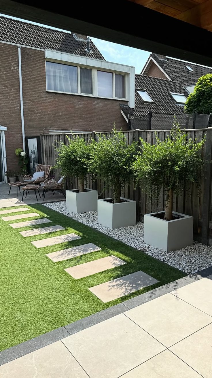This garden showcases a clean, minimalist approach to landscaping, perfect for modern outdoor spaces. Three well-pruned ornamental trees stand in sleek, square white planters, their lush green foliage forming a crisp contrast against the pale gravel base beneath them. The planters sit in a neat border along the wooden fence, creating a structured yet calming backdrop for the garden.