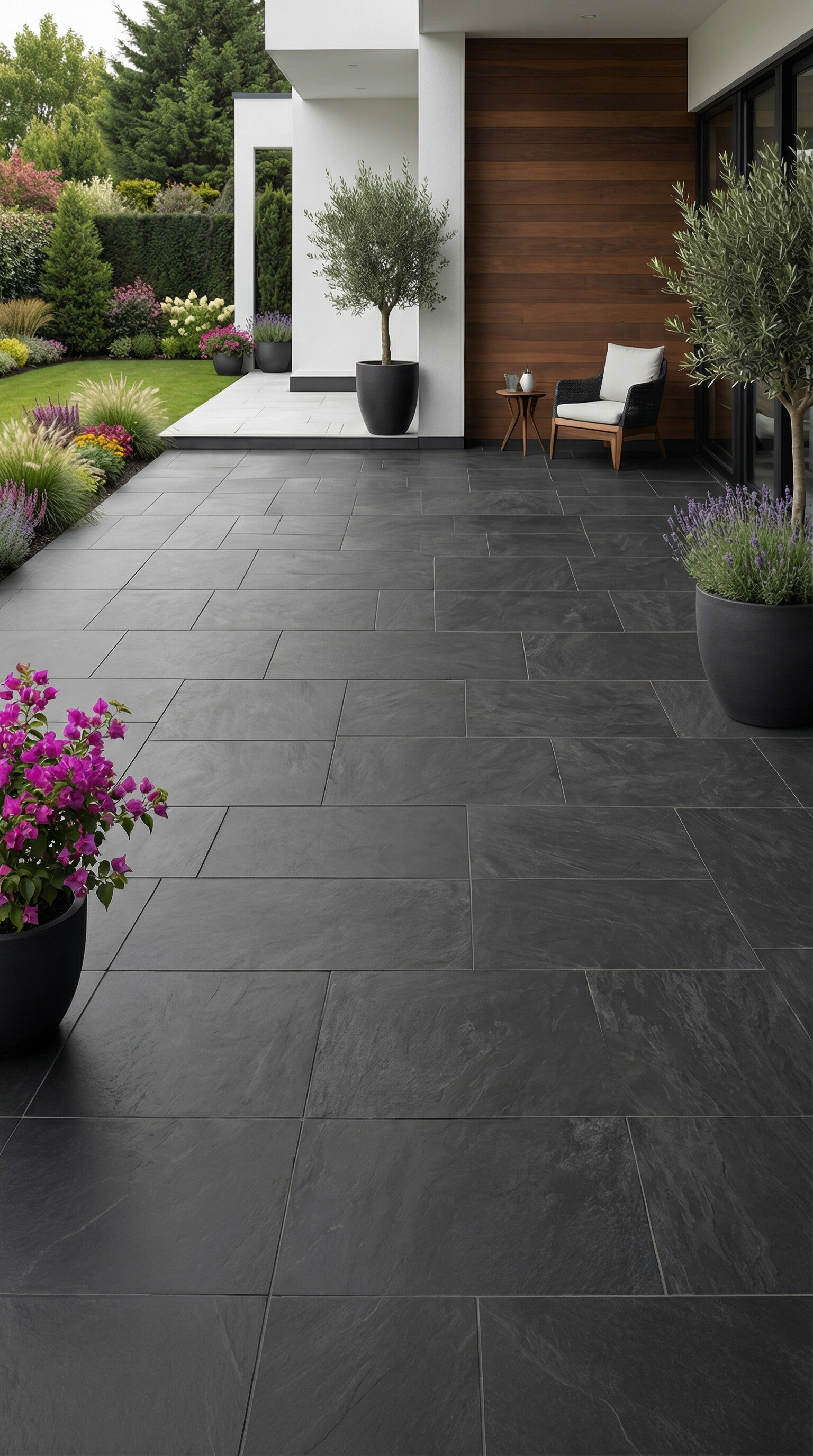 Check out the sleek, ultra-modern patio with its large slate tiles that give off a cool, sophisticated vibe. The clean lines create a sense of spaciousness, making it perfect for outdoor relaxation. Potted plants like olive trees and colorful flowers add a touch of nature, softening the contemporary look.