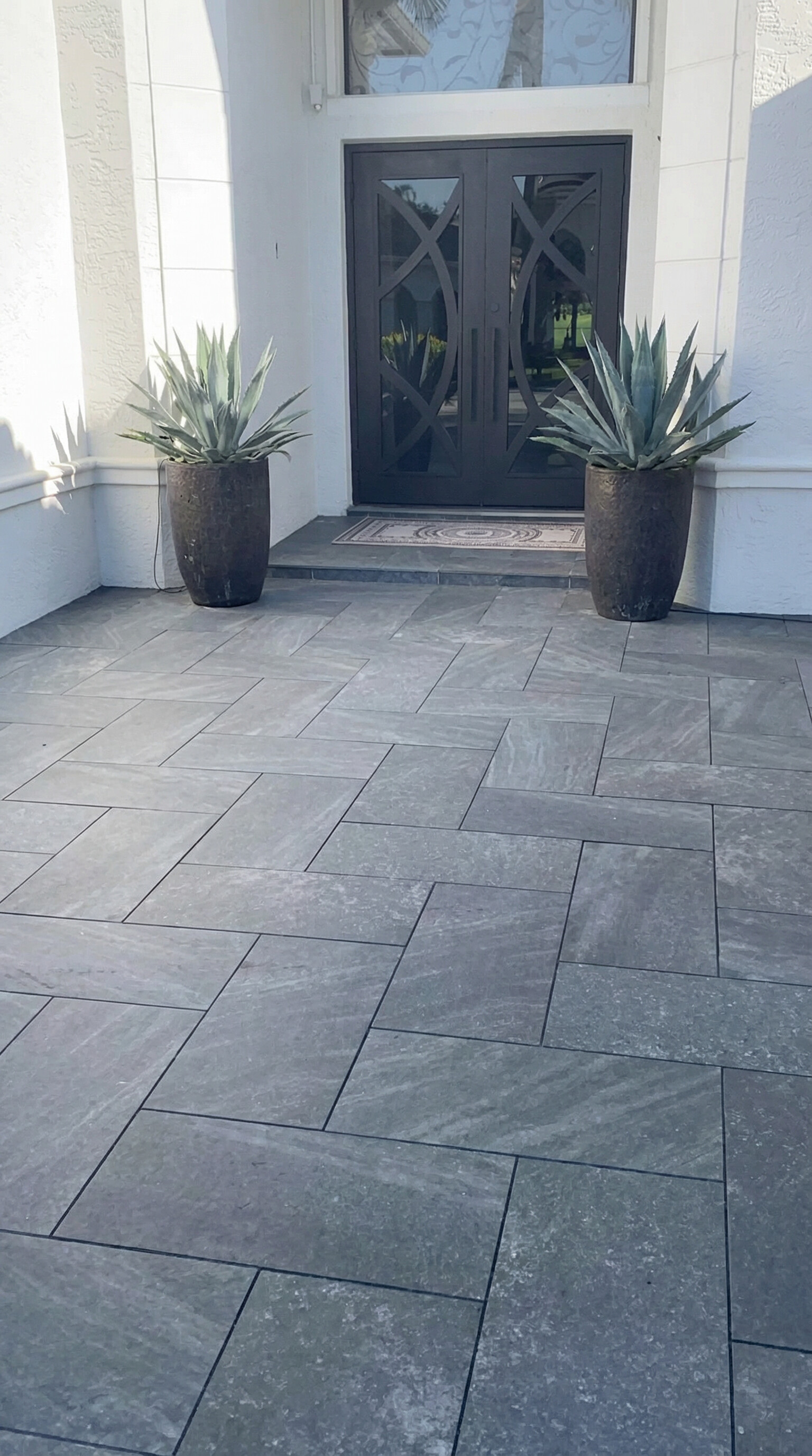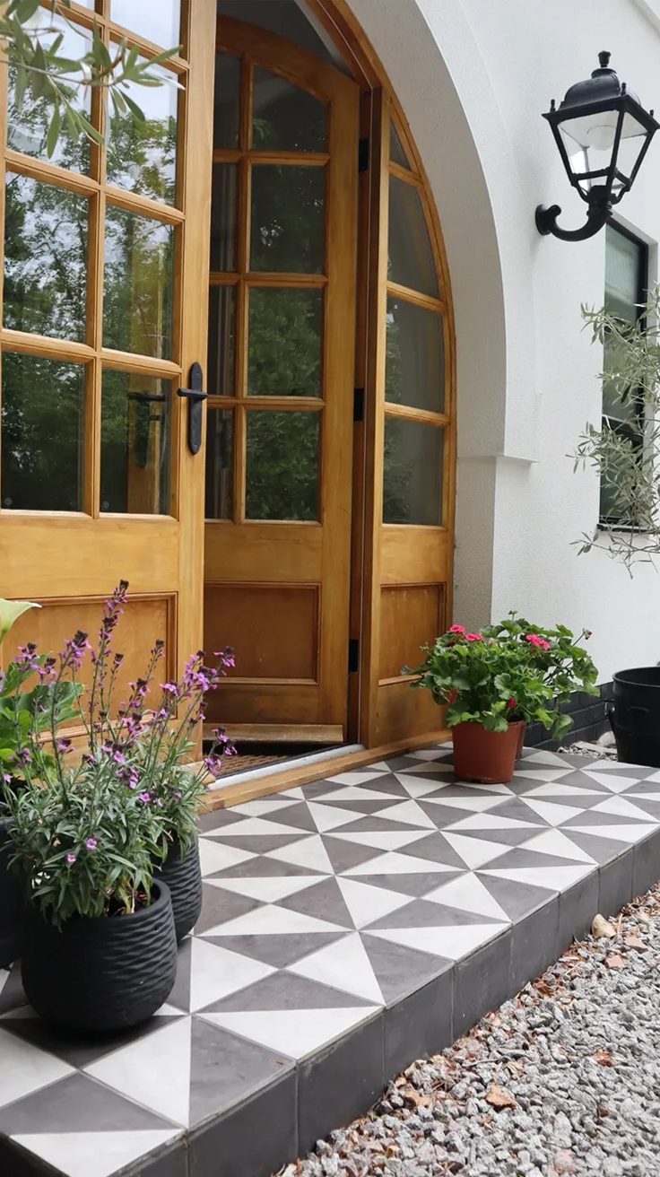 Large potted plants flank the entrance. Their sharp, architectural leaves add a touch of nature and contrast nicely with the clean lines of the tiles. The pots’ dark color ties in with the sophisticated black doors, creating a cohesive look.