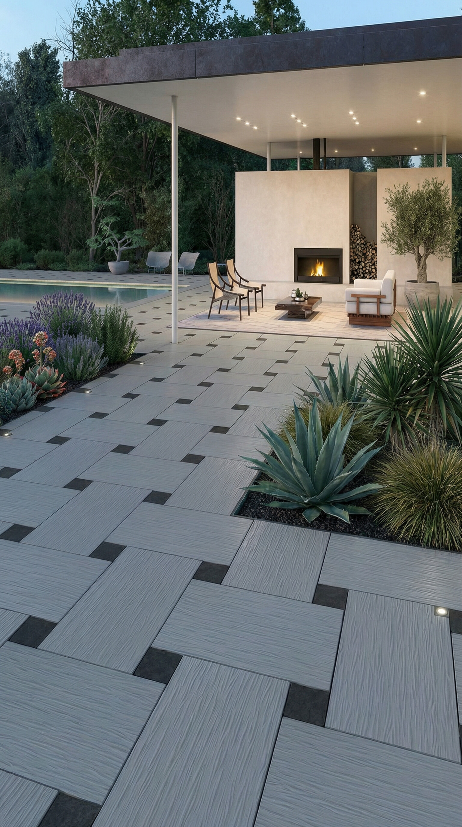 The sleek geometric pattern of the patio immediately grabs attention. Light gray tiles with darker accents crisscross the ground, providing a clean and contemporary look. It feels open and inviting, perfect for lounging around.