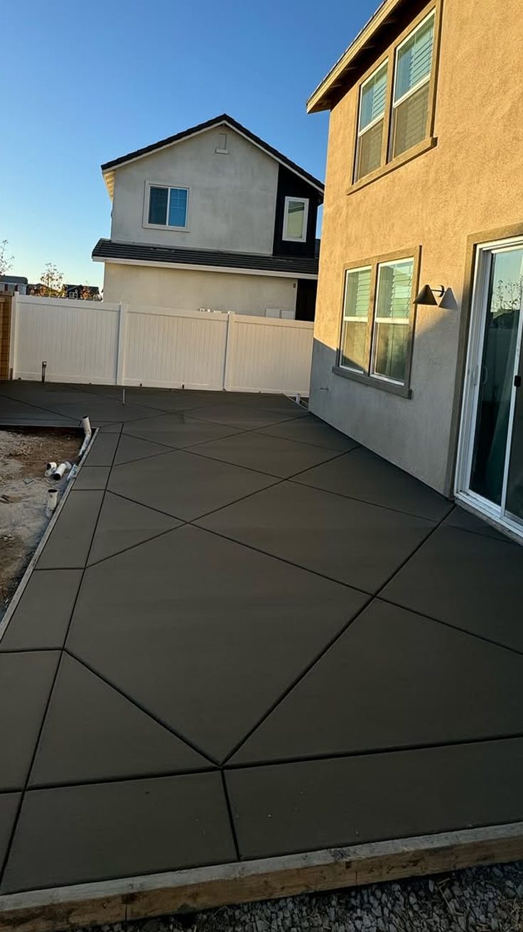 Clean lines and geometric patterns dominate the patio. The concrete slabs are divided into sharp, bold shapes that create a sleek, modern look. It extends seamlessly from the house, offering a generous space for outdoor activities.