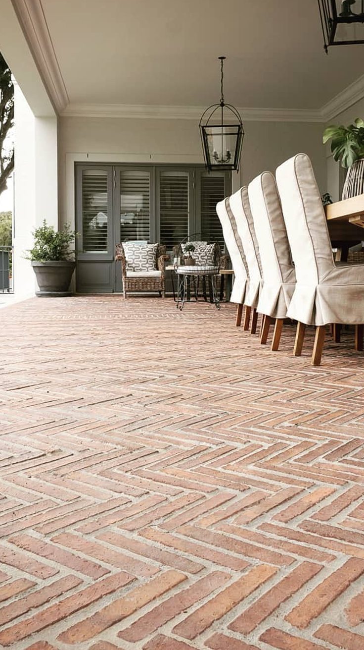 Rich, warm tones of the herringbone brick floor draw your attention immediately. It sets a cozy, inviting vibe that makes you want to linger. The textured pattern provides a bit of visual interest without being overpowering.