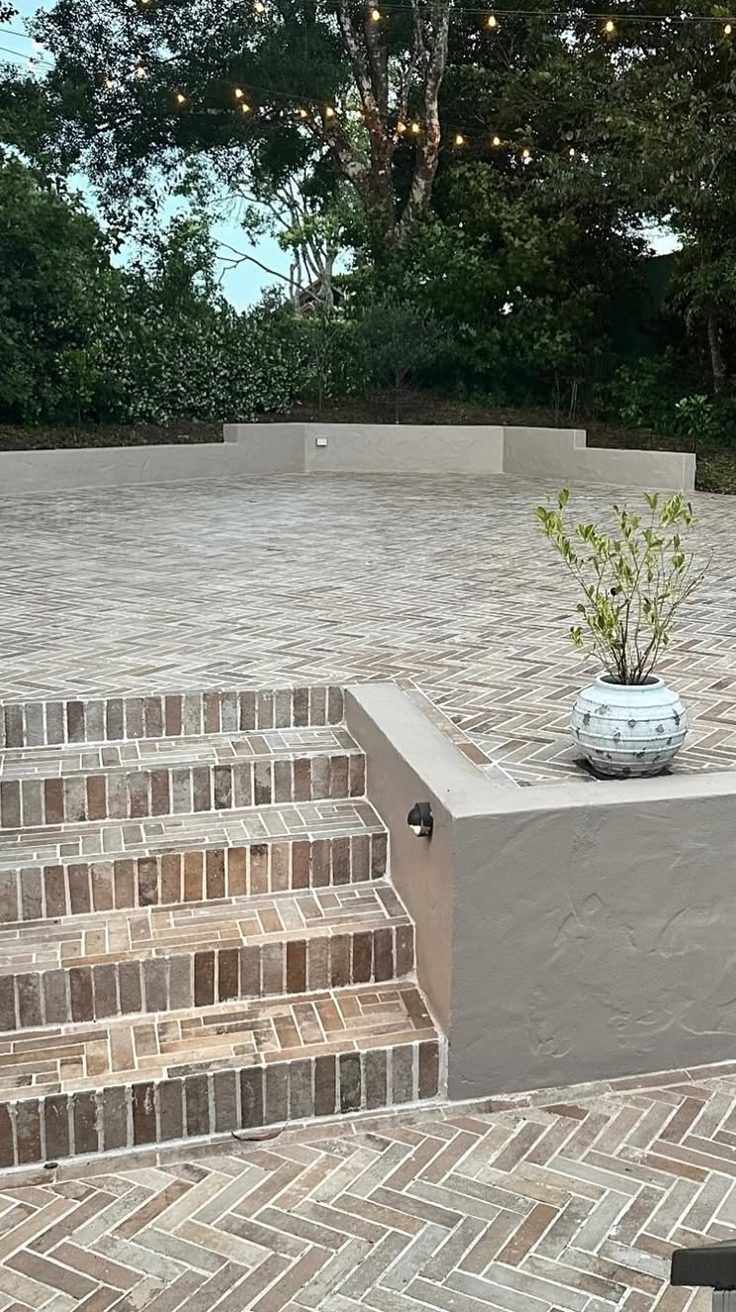 The herringbone pattern of the brick patio catches your eye first. It adds a touch of elegance while keeping the overall feel grounded and earthy. The steps have the same brickwork, tying everything together neatly and adding a bit of texture.