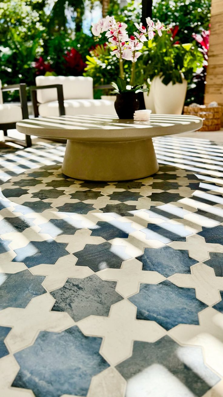 Geometric star patterns in blue and white pop on the tiled floor. Light and shadow create striking contrasts, drawing attention to the design. It feels refreshing and cool, perfect for a relaxed setting.