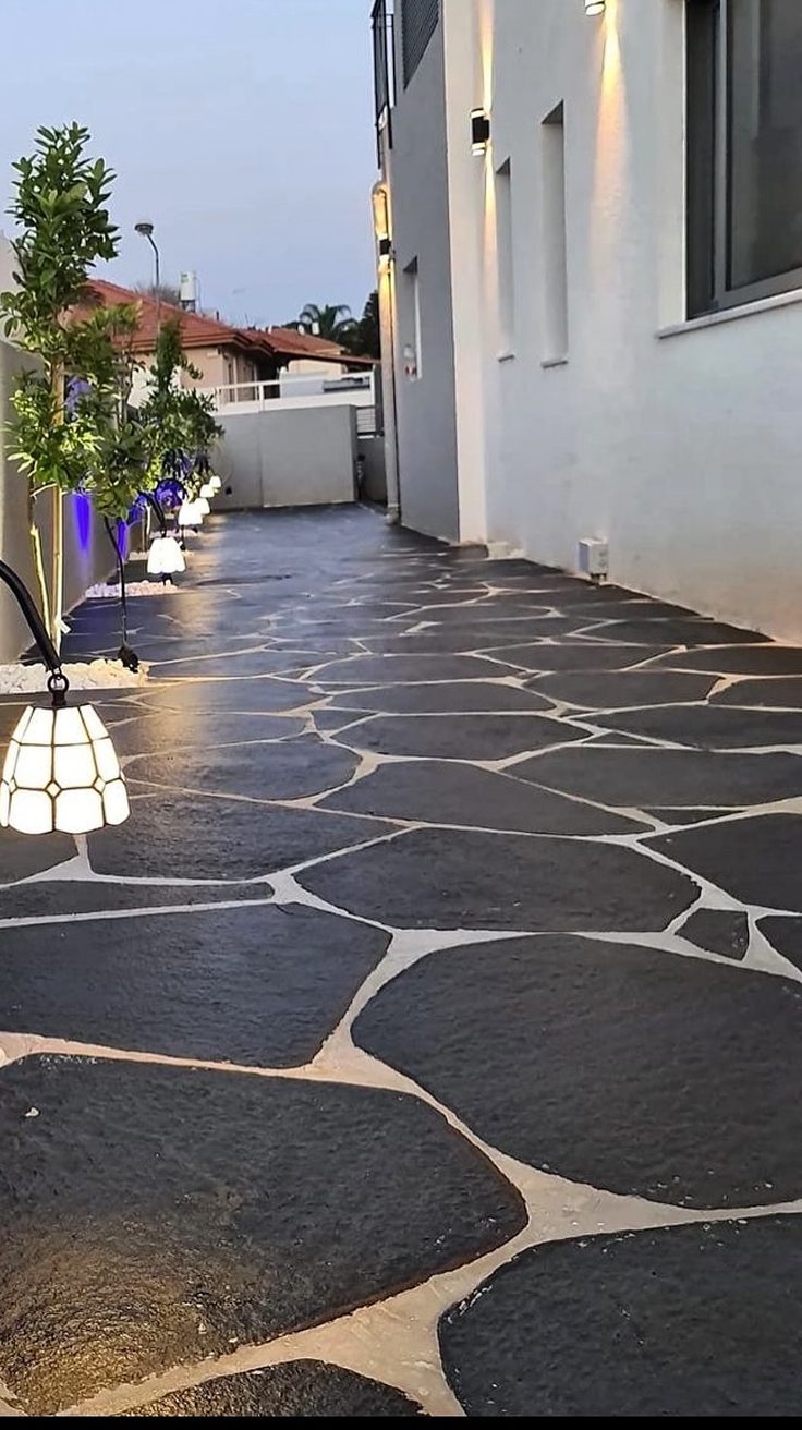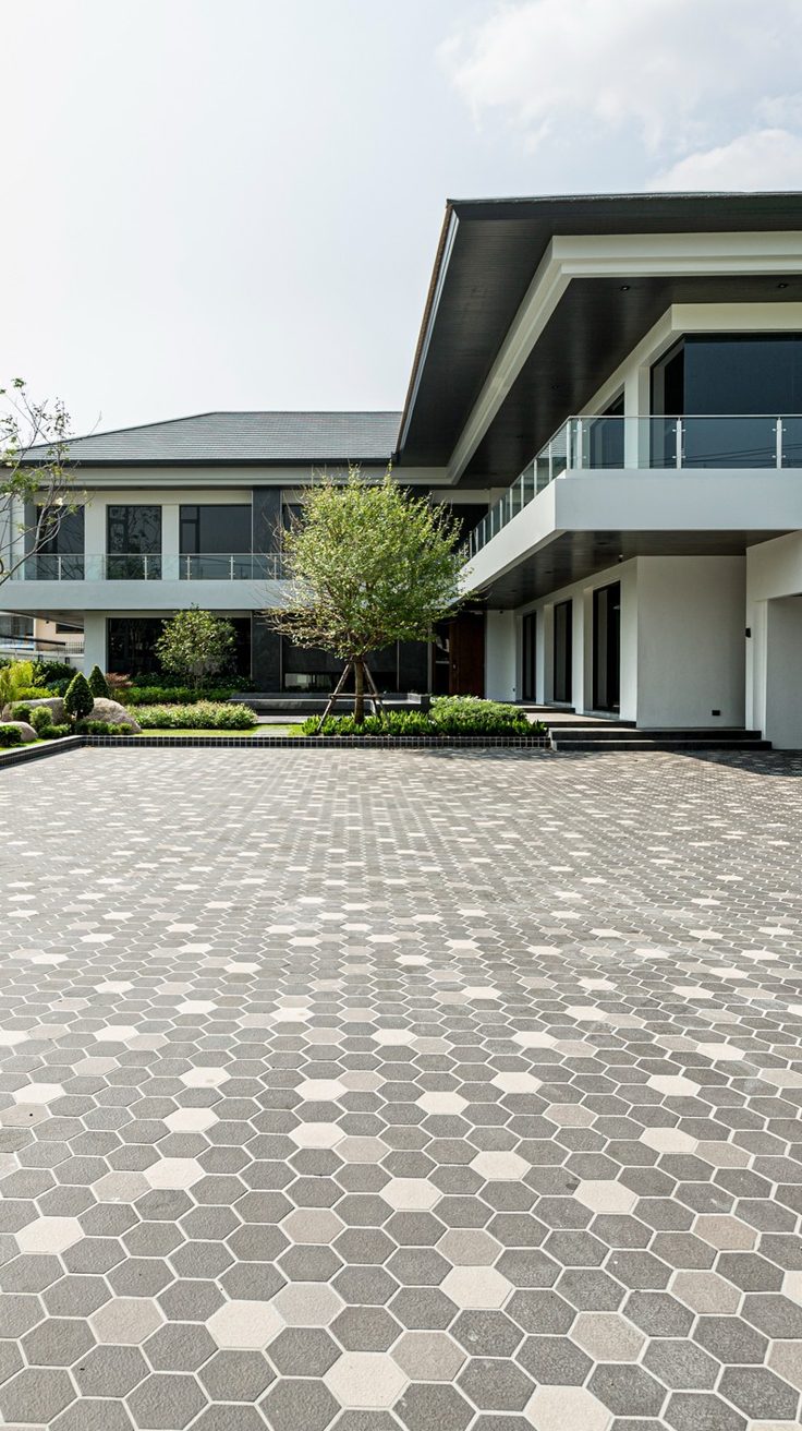 Hexagonal tiles in varying shades of grey stretch across a vast courtyard. The neat, geometric pattern draws your eye toward a modern house in the background. It’s a striking display of symmetry and style.