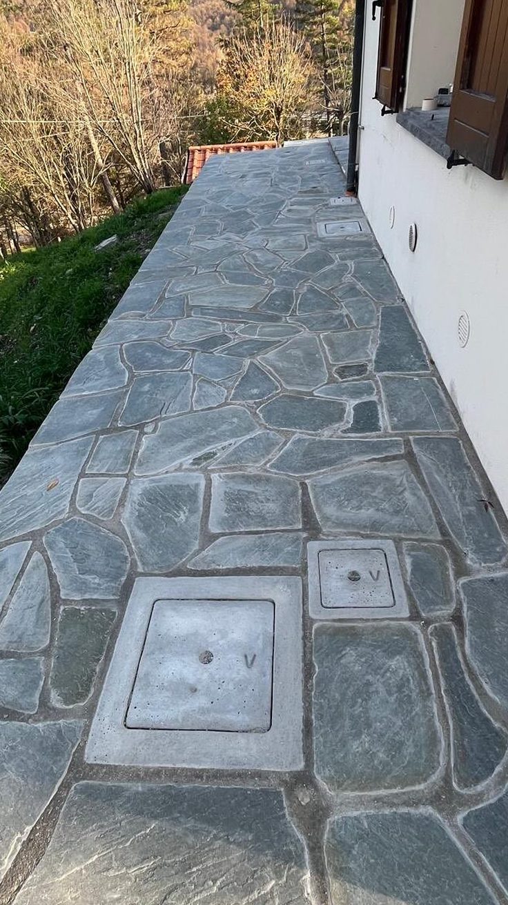 The slate stones beneath your feet are laid out in a random yet harmonious pattern. Each piece has a distinct shape and shade, creating a natural mosaic. The light gray grout between the stones highlights their individual forms without overpowering the overall look.