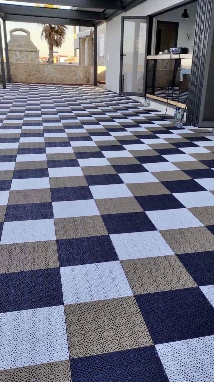 The geometric pattern on this patio stands out with its neat checkerboard design. It combines black, white, and tan squares, each with intricate textures. This setup adds a modern touch and draws the eye across the space.