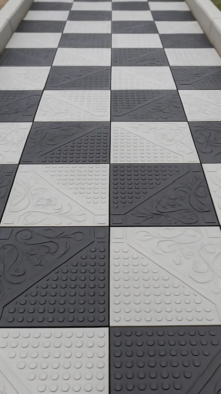 Stark patterns jump out with alternating black and white tiles, laid out in a neat checkerboard design. Each square is divided into a textured half with subtle dots, and a smooth half adorned with floral motifs. This combination stops it from feeling too cold or industrial, adding a touch of elegance.
