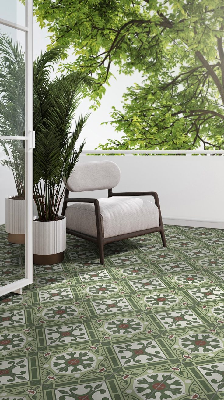 The tiles are the first thing you notice with their intricate green patterns set against a white background. They run seamlessly across the patio, creating a vibrant, artistic look. The design seems both classic and modern, making it an interesting focal point for any space.