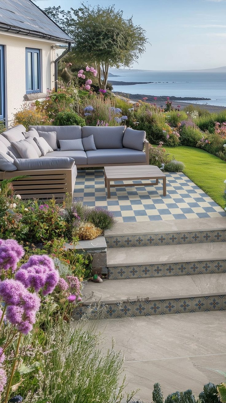 The checkered patio tiles give a playful touch to the space. Paired with a sleek gray outdoor sofa, it creates a cozy corner for lounging. The small, wooden coffee table ties the seating area together nicely.