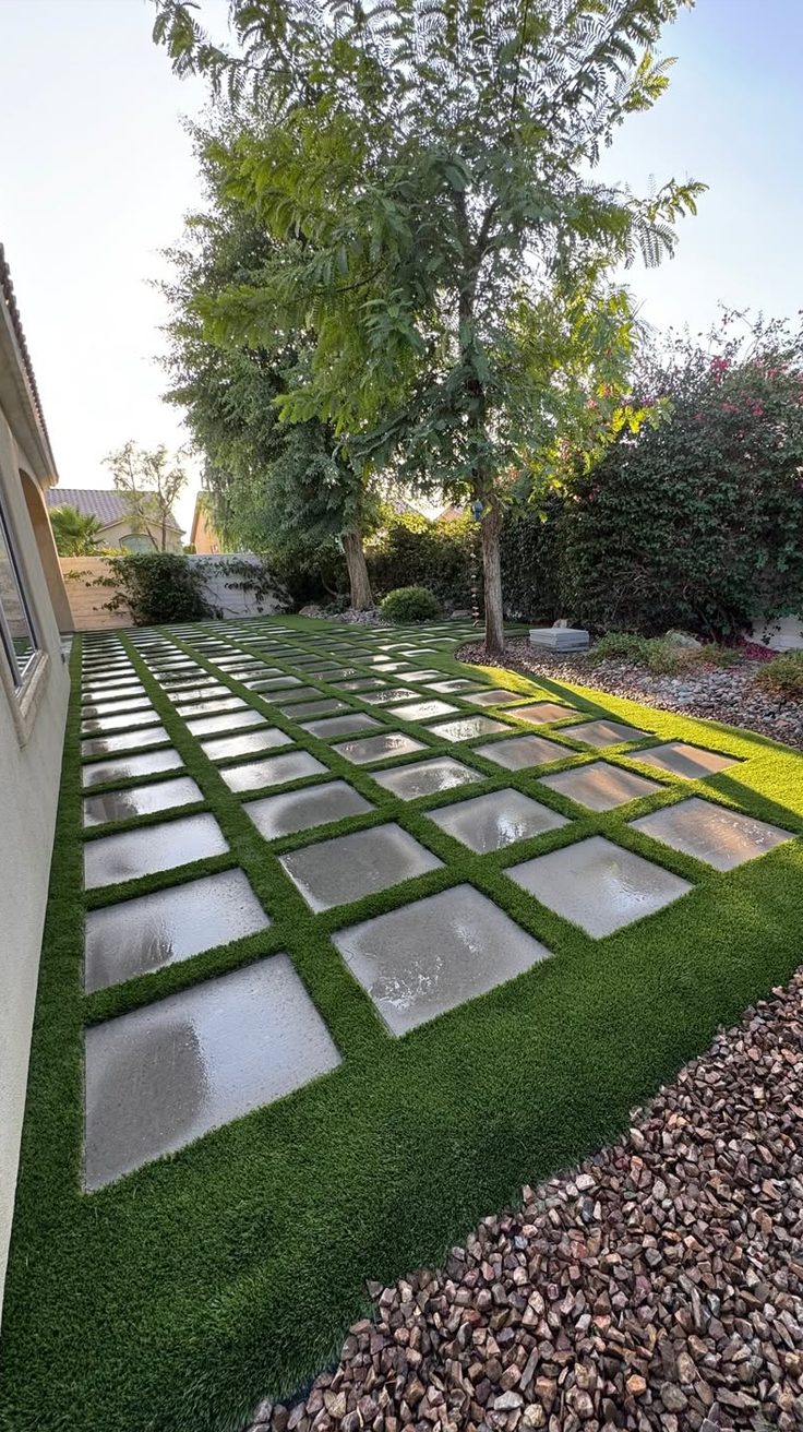A neat grid of square concrete tiles is laid out amidst lush, green artificial grass. The path leads toward some trees, providing a sharp contrast between the modern grid and the natural elements.