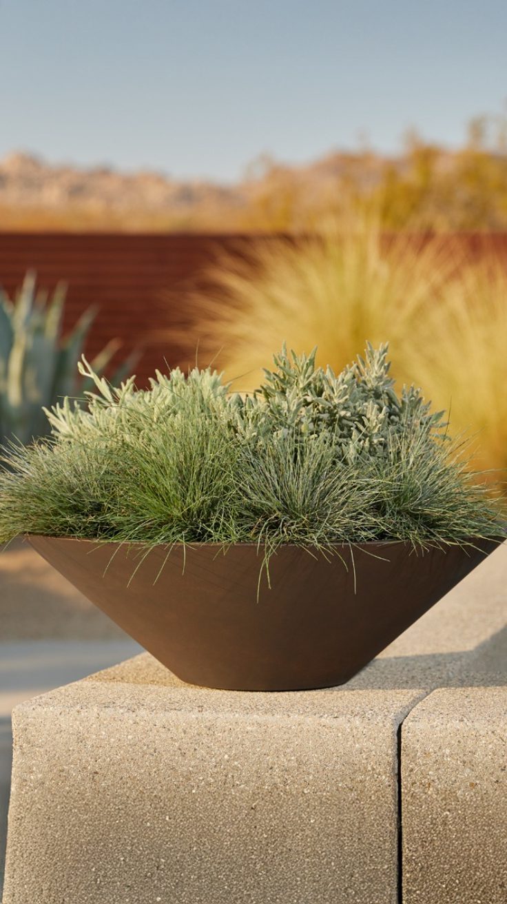The bowl planter has a smooth, matte finish that complements the desert setting perfectly. Filled with a lush mix of silvery-green grasses and succulents, it stands out against the muted sandy backdrop. It’s perched on a textured concrete surface, adding a modern touch to the natural scene.