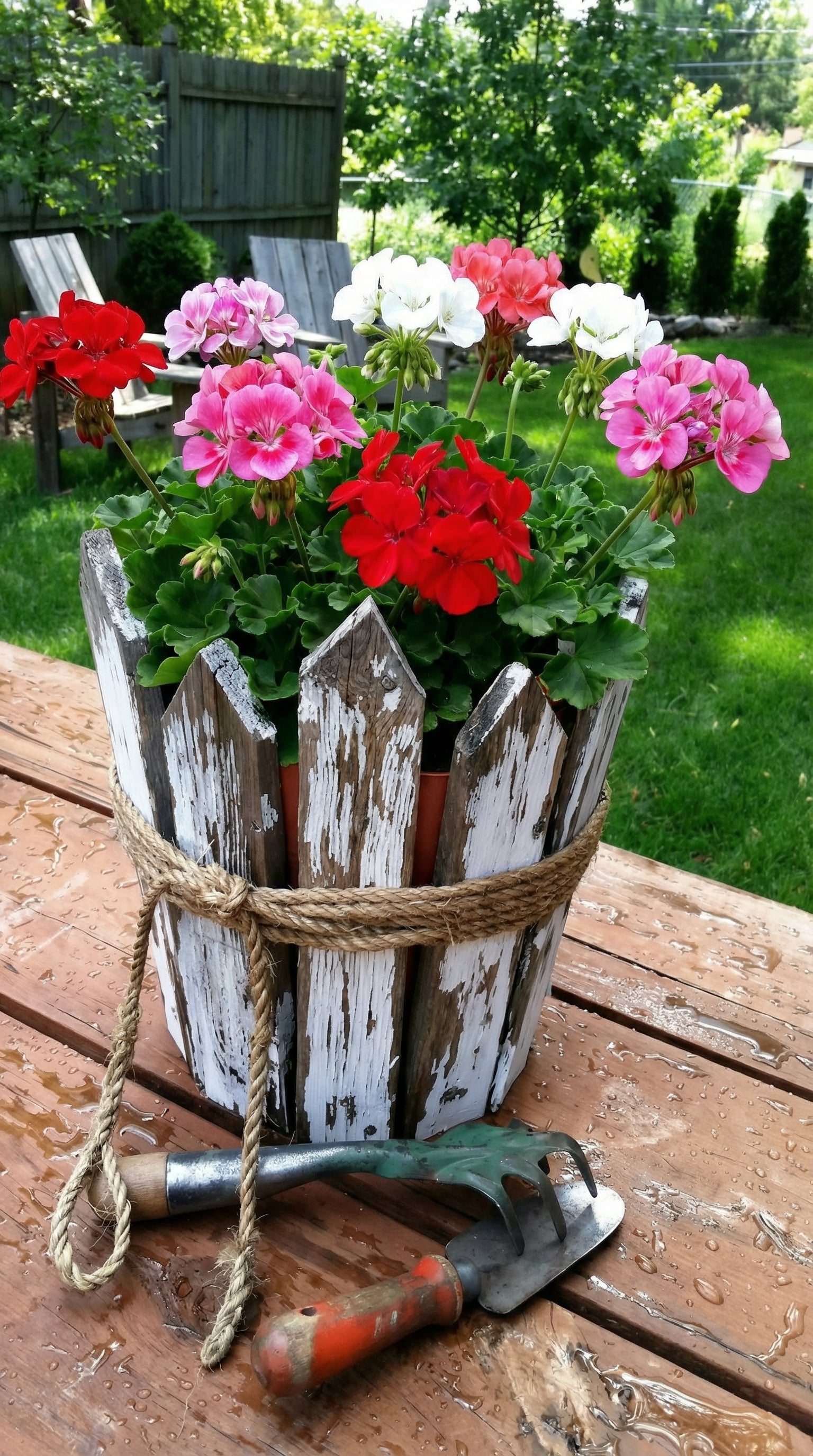 Bright red and pink geraniums burst from a rustic planter wrapped with worn rope. The whitewashed wood contrasts sharply with the vibrant blooms. It’s sitting on a wooden table speckled with water droplets, adding an earthy touch.