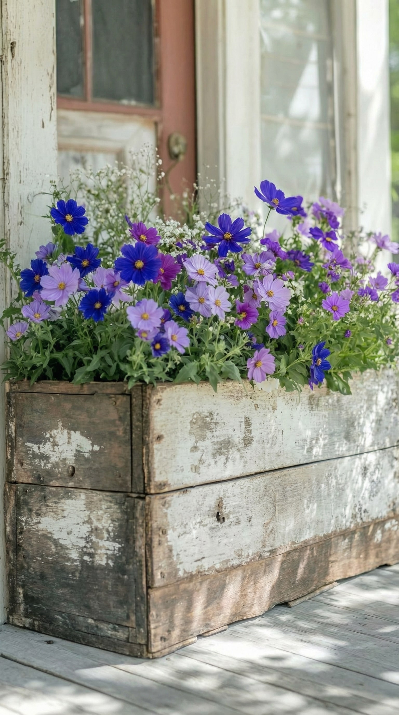 A burst of color hits you right away with the vibrant purple and blue flowers. They’re set against a charmingly weathered wooden box that has a rustic, shabby chic vibe. It’s placed on a porch, which gives the whole scene a peaceful, homely feel. The old door in the background with faded paint adds to the nostalgic atmosphere.