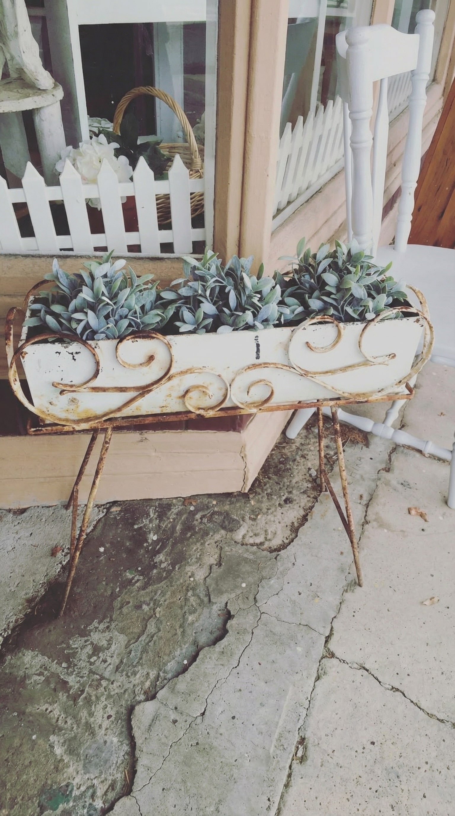 This plant stand catches your eye with its weathered metal frame and intricate swirls. Standing on thin, delicate legs, it has a charming, rustic feel that complements the surrounding space. The planter is filled with a neat row of small, lush green plants that bring a fresh touch to the earthy tones.