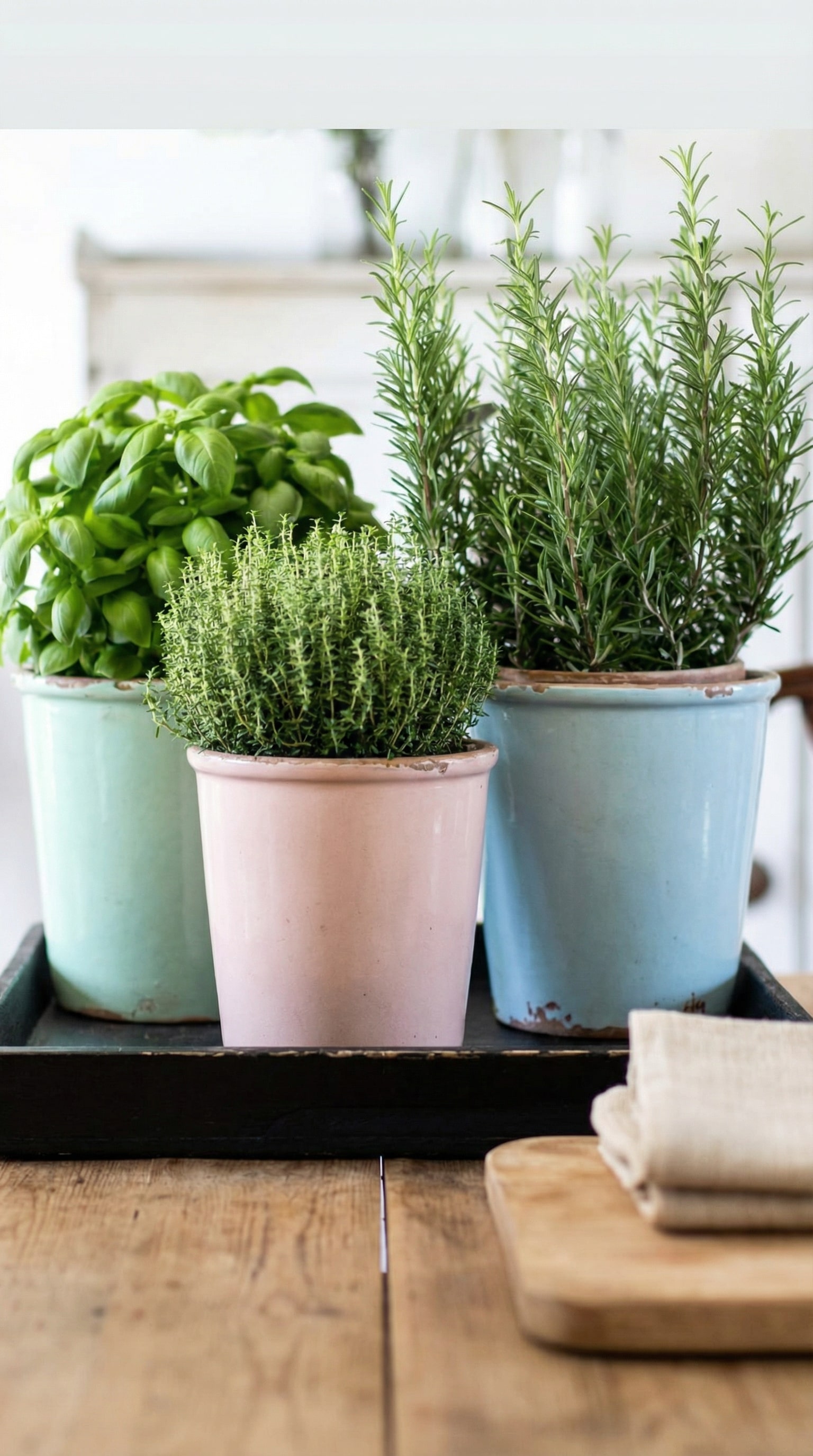 These pots sit neatly on a black tray, adding a touch of contrast to the soft colors. The rustic wooden table underneath gives it a cozy farmhouse feel. It’s a practical setup for any home cook who wants to keep herbs within easy reach.