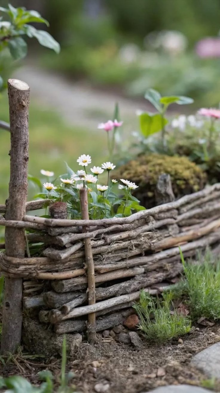 Nestled in a corner is a quaint, handwoven fence made of twisted branches. It cradles a patch of earth where delicate white flowers are blooming. The backdrop is a soft blur of greenery, adding depth and serenity.